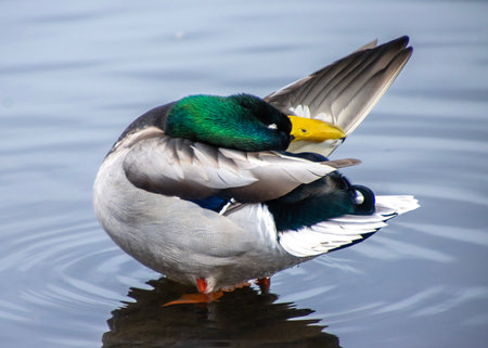 A mallard duck stands on one leg in tranquil water, preening its vibrant feathers under the sunlight. The serene setting highlights the beauty of nature and wildlife.