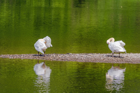 A mute swan (Cygnus olor) is basking in the water on a small pond in southern Germany during summer