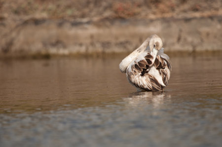 Juvenile greater flamingo Phoenicopterus roseus preening. Vargas. Aguimes. Gran Canaria. Canary Islands. Spain.