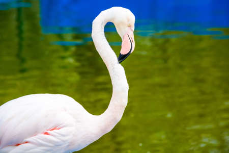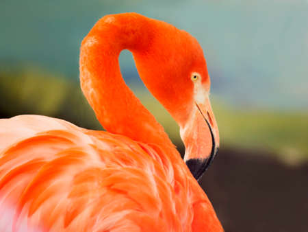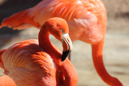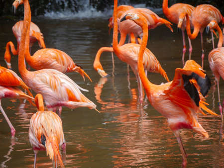 Caribbean flamingos also known as American flamingo (Phoenicopterus ruber) is a large species of flamingo relaxing in water river