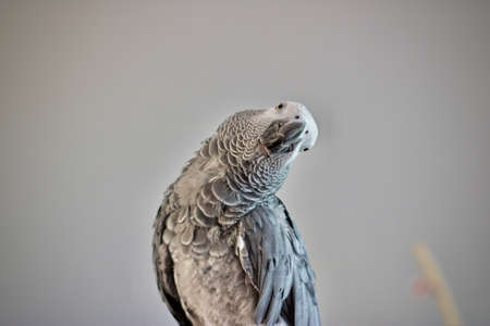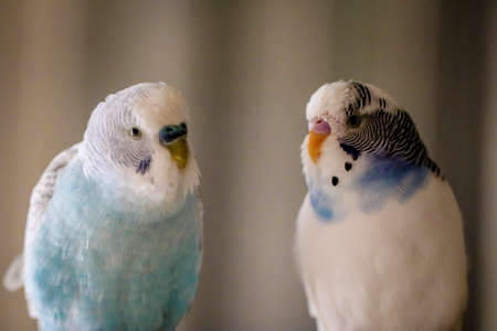 Small bright blue parrots birds sitting on tree branch on blurred copy space background. Keeping pets at home concept.