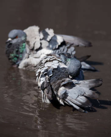 Two black and white rock pigeon bird (columba livia)standing perched on electric wires with bright blue sky and vast space