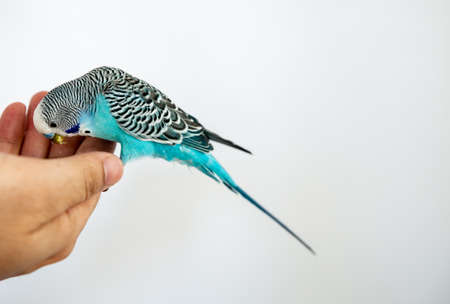A beautiful blue budgie sits in the child's hand. Tropical birds at home. Feathered pets at home.