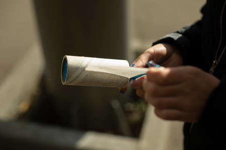 Adhesive tape to remove wool from clothes. Tool for cleaning clothes from hair. Girl holds in her hand an object for removing dirt from things.