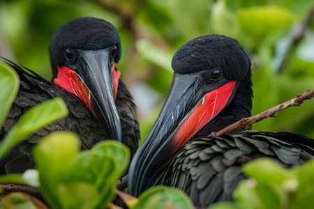 Close-up of two frigatebirds with distinctive red throat pouches among lush leaves