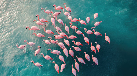A spectacular aerial view of a large group of flamingos forming patterns in the shallow water.