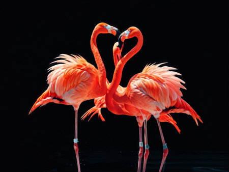Witness the beauty of nature's love as a pair of graceful pink flamingos come together to create a heart shape in a tranquil reflection pond. This enchanting image symbolizes the universal language of love found in the animal kingdom