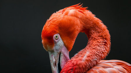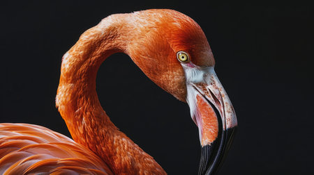 Close up of a vibrant orange flamingo, highlighting its unique features against a soft dark background