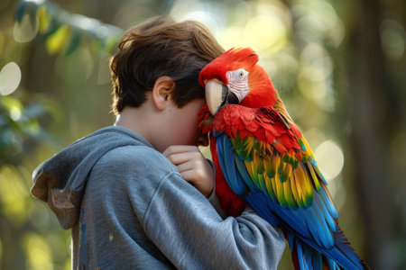 Caucasian boy interacting with a colorful parrot in a sunlit forest. Concept of child with pet, nature, friendship, outdoor bonding.