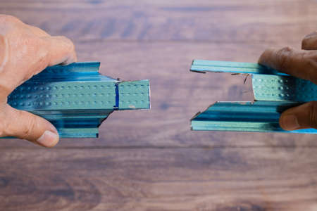 Straight hanger for plasterboard. Drywall Brackets. Long perforated plates are made of galvanized steel. Fixture for the construction of gypsum plasterboard framework. Selective focus.