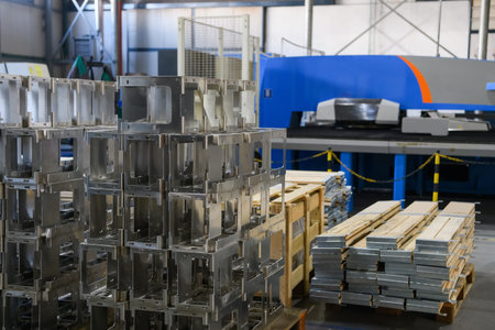 The first phase of metal and aluminum processing. Processed products from CNC machines stacked on a pallet in a large modern factory