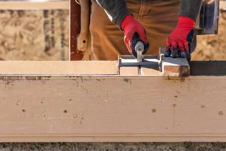 Building contractor carpenter placing new building wood engineered trusses on a residential under construction