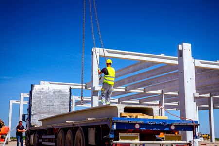 Worker is preparing crane hook for unloading concrete joist from truck trailer.