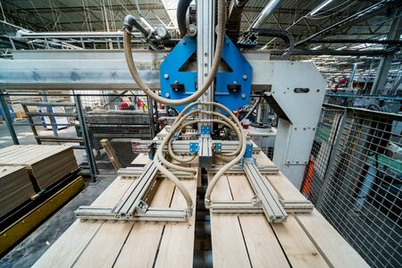 Carpentry factory. Automated equipment for laminate production. Modern robotic factory indoors. Woodworking productionCarpenters working on wood factory with machines. Wooden furniture manufacturing process. Carpentry workshop location.
