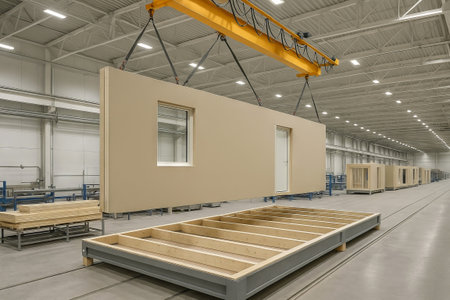 Assembly of a modular home in a modern factory setting highlighting innovative construction techniques and contemporary architecture concepts.