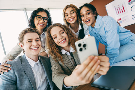 Cheerful business colleagues taking selfie together in modern office setting showcasing teamwork and collaboration