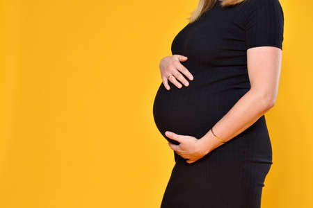 Motherhood, femininity, love, care, waiting, hot summer - bright croped Close-up unrecognizable pregnant woman in floral black dress with hands over tummy rub belly on yellow background, copy space
