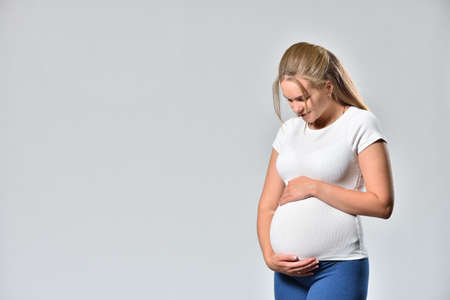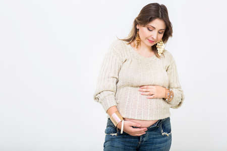 Pregnant caucasian woman touching her belly. Studio shot