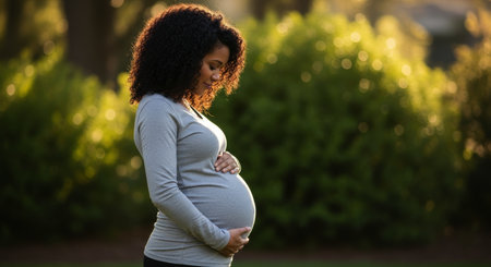 African american woman in late pregnancy standing outdoors, gently cradling her baby bump. represents motherhood, new life, and family anticipation.