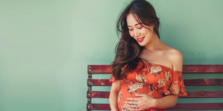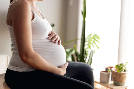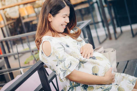 Portrait of young Asian pregnant woman sitting and touching her belly with her hands. Conceptual of pregnant woman lifestyle.