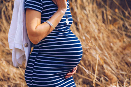 Pregnant woman caressing her tummy in the field