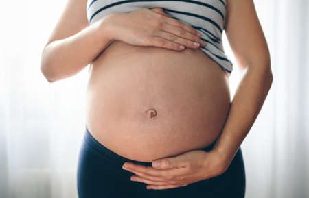 Close-up of a pregnant woman in a white shirt, gently stroking her stomach with her hands in the late stages of pregnancy. Waiting for the baby. High quality photo