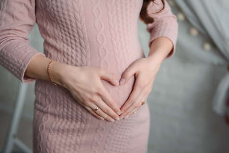 Waiting for a baby. The woman hands are on her stomach.