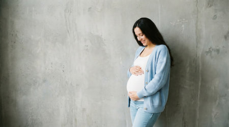 A smiling expectant mother with dark hair gently cradles her pregnant belly. She wears a blue cardigan and stands against a minimalist concrete wall with copy space.