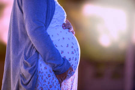 Closeup of pregnant belly at sunset.