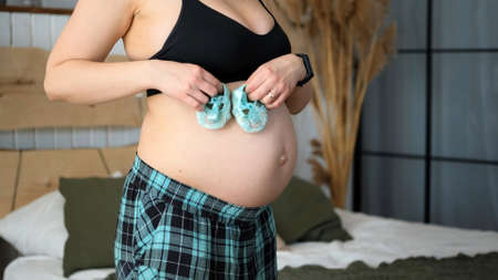 Pregnant Woman Puts Cute Booties for Newborn on Belly. Motherhood, Preparation and Expectation of Baby Concept