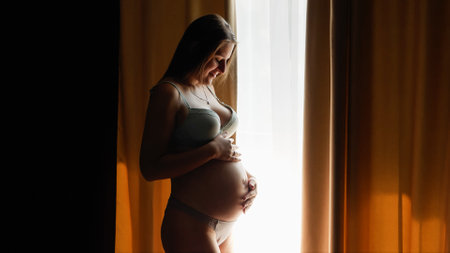 Young beautiful pregnant woman standing by the window looking holding her belly waiting for the baby