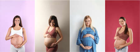 Collage with photos of beautiful pregnant women on different color backgrounds. banner design