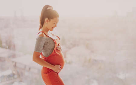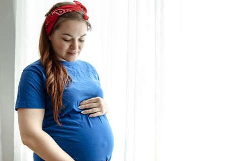 Banner of Happy Pregnant Woman standing in front of windows and stroking big belly with love at cozy home,Pregnancy of young woman enjoy with future life,Motherhood and Pregnant Concept