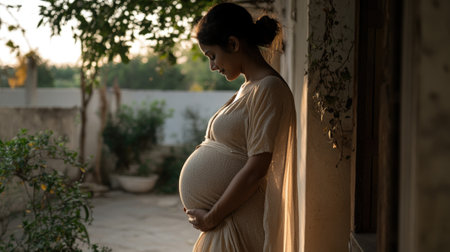 Maternal Serenity: pregnant Indian woman, grace of impending motherhood, portrayed in traditional clothing with cultural motifs, reflecting joy, significance of this special time in her life