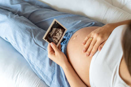 Pregnant woman holding ultrasound scan photo on her belly at home. Mother with sonogram of her unborn baby. Concept of pregnancy, Maternity prenatal care