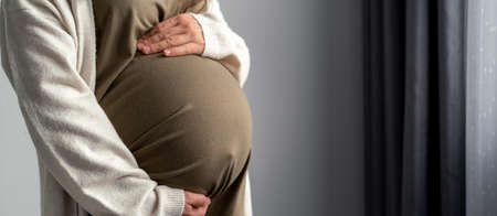 Pregnant woman holds hands on belly on a gray background. Copy space, pregnancy, motherhood, people and expectation concept. Close-up, copy space, indoors. Toned photo of pregnancy.