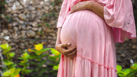 A young European pregnant girl in a pink dress gently touches her big stomach with her hands, stands on the back green garden