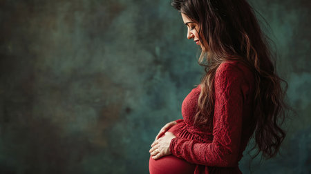 Side profile of pregnant woman with long hair, hands resting on belly, symbolizing family, bonding, and anticipation