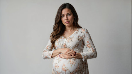 A pregnant woman standing in front of a wall with her hands on the belly, AI