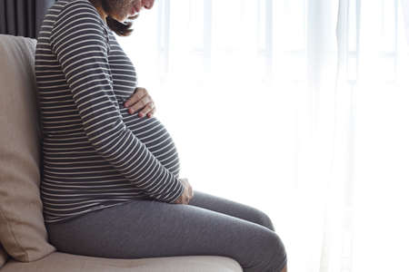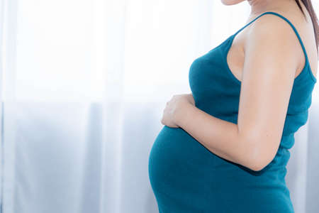 young pregnant woman staying at home and protected her belly, concept for protection tummy baby from Covid-19 Coronavirus pandemic