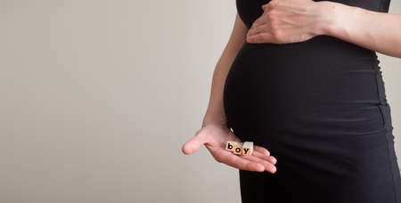 Pregnant woman with boy word made of blocks. Parent in waiting baby boy. Banner with copy space.