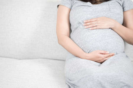 Close up young beautiful pregnant woman hand touching her belly while sitting on gray sofa at home with copy space. Happy pregnant girl relaxing on couch in love and motherhood concept.