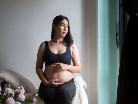 Asian Pregnant woman sitting on floor near her bed and touching her belly in bedroom. Beautiful Young Female looking and hugging her tummy at home. Tenderness, Motherhood, Pregnancy