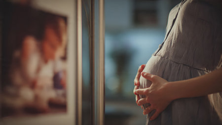 A pregnant woman gently cradles her baby bump, standing next to a framed picture, embodying anticipation and love.