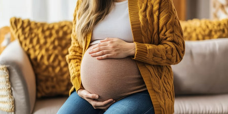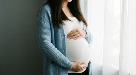 A pregnant woman in a white shirt and blue cardigan gently holds her baby bump. She stands in soft natural light from a nearby window, conveying a sense of peace and anticipation.