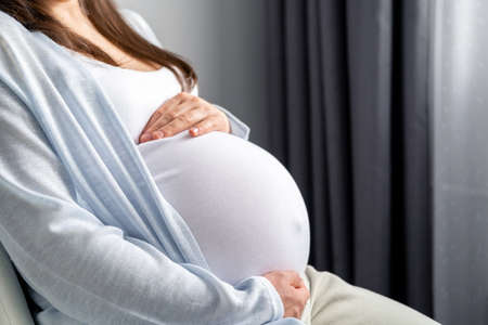 Close-up of pregnant female model holding belly. Woman in dress and cardigan sitting on bed. Pregnancy, expectation concept