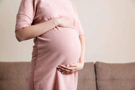 Close-up of the belly of the expectant mother in the last months of pregnancy.