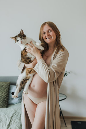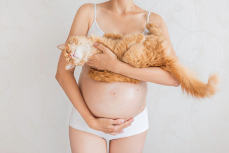 Pregnant woman in white underwear with cute ginger cat. Woman expecting a baby. Risk of infection toxoplasmosis.