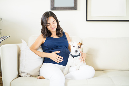 Cute puppy protecting pregnant woman sitting on sofa at home