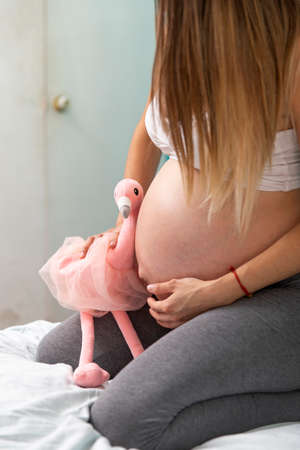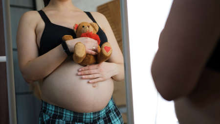 Closeup of Pregnant Woman Touching her Belly while Hugging Teddy Bear in Front of Mirror at Home